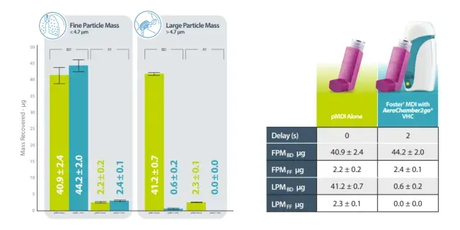 This study demonstrates that the AeroChamber2go* spacer helps ensure consistent delivery of the intended dose to the lungs (related to the fine particle mass), even with poor coordination between actuation and inhalation likely experienced during exacerbations. Additionally, the AeroChamber2go* spacer significantly reduces the deposition of larger particles in the oropharynx (throat) compared to using an MDI alone, particularly important with inhaled corticosteroids. These results suggest that the new and portable AeroChamber2go* VHC can enable effective MDI drug delivery outside of the home.