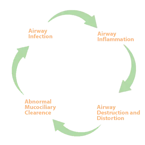 Bronchiectasis is characterized by permanently widened or dilated airways (know as bronchi) with thick walls and scarring. Your airways produce mucus (also called sputum) to help trap and remove germs and particles that enter your lungs. Tiny hair-like structures called cilia help move mucus out of your airways up to your throat to prevent infection. Bronchiectasis damages your cilia, so your airways can’t clear themselves properly. When this happens, mucus builds up in pockets in the widened airways and attracts bacteria – leading to a chronic cycle of lung infections and inflammation, and further damage to your airways.