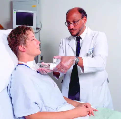 La chambre d’inhalation anti-statique à valve AEROTRACH PLUS* est spécialement conçue pour administrer des traitements par aérosol-doseur aux patients ayant subi une trachéostomie.