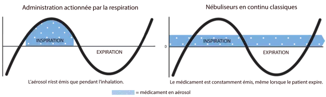 Avec la fonction d’administration actionnée par la respiration, l’aérosol n’est produit que lorsque vous inspirez. Cela signifie qu’il n’y a aucun gaspillage de médicament entre les respirations ou si vous devez prendre une pause (par exemple, si vous devez tousser ou avoir une conversation). Ainsi, c’est vous qui maîtrisez votre traitement en aérosol. Les autres nébuliseurs produisent continuellement leur aérosol, peu importe que vous inspiriez, expiriez ou entre les 2. Ceci, ayant pour conséquences, qu'une partie du traitement, se dissipe dans l’air au lieu d’être administré à vos poumons.