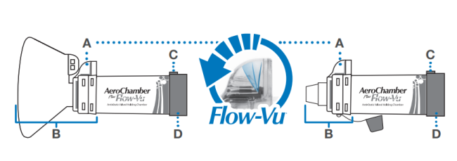 4 หากต้้อ งการประกอบใช้้งานใหม่่ ให้้ ใส่่ส่่วนด้้า นหน้้า (B) ลงในปลายด้้าน หนึ่่งของกระบอกแล้้วหมุุนให้้แน่่นจนล็็อคเข้้าที่่ จััดวางแนวในการใส่่ (C) ที่่อยู่่บนส่่วนด้้า นหลัังให้้อยู่่ กึ่่งกลางด้้วยตััวบอกการหายใจเข้้า Flow-Vu* (A) ตามที่่แสดง กดให้้แน่่นเพื่่อใส่่ส่่วนด้้า นหลััง (D)