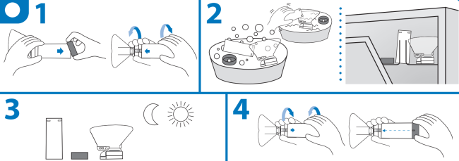 2 หน้้ากาก: ใส่่หลอดยาชนิิดสููด พ่น่ ลงที่่ส่่วนด้้า นหลังั ของกระบอกพ่น่ ยา สวมหน้้า กากและตรวจสอบให้้แน่่ ใจว่า่ หน้้า กากครอบมิิดชิิด. ที่่เป่่ าปาก: ใส่่หลอดยาชนิิดสููดพ่่นลงที่่ส่่วนด้้า นหลัังของกระบอกพ่่นยา นำำที่่เป่่ าปากใส่่เข้้า ไปในปาก แล้้วปิิดปากรอบที่่เป่่ าปากให้้มิิ ดชิิด