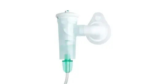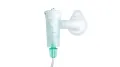 Remove the mouthpiece from your AEROECLIPSE* BAN* Nebulizer. Attach the Elbow Adapter (B) to the mouthpiece opening. Caution: The AEROECLIPSE* BAN* Nebulizer must always be upright when used with the mask, even when lying back for a treatment.