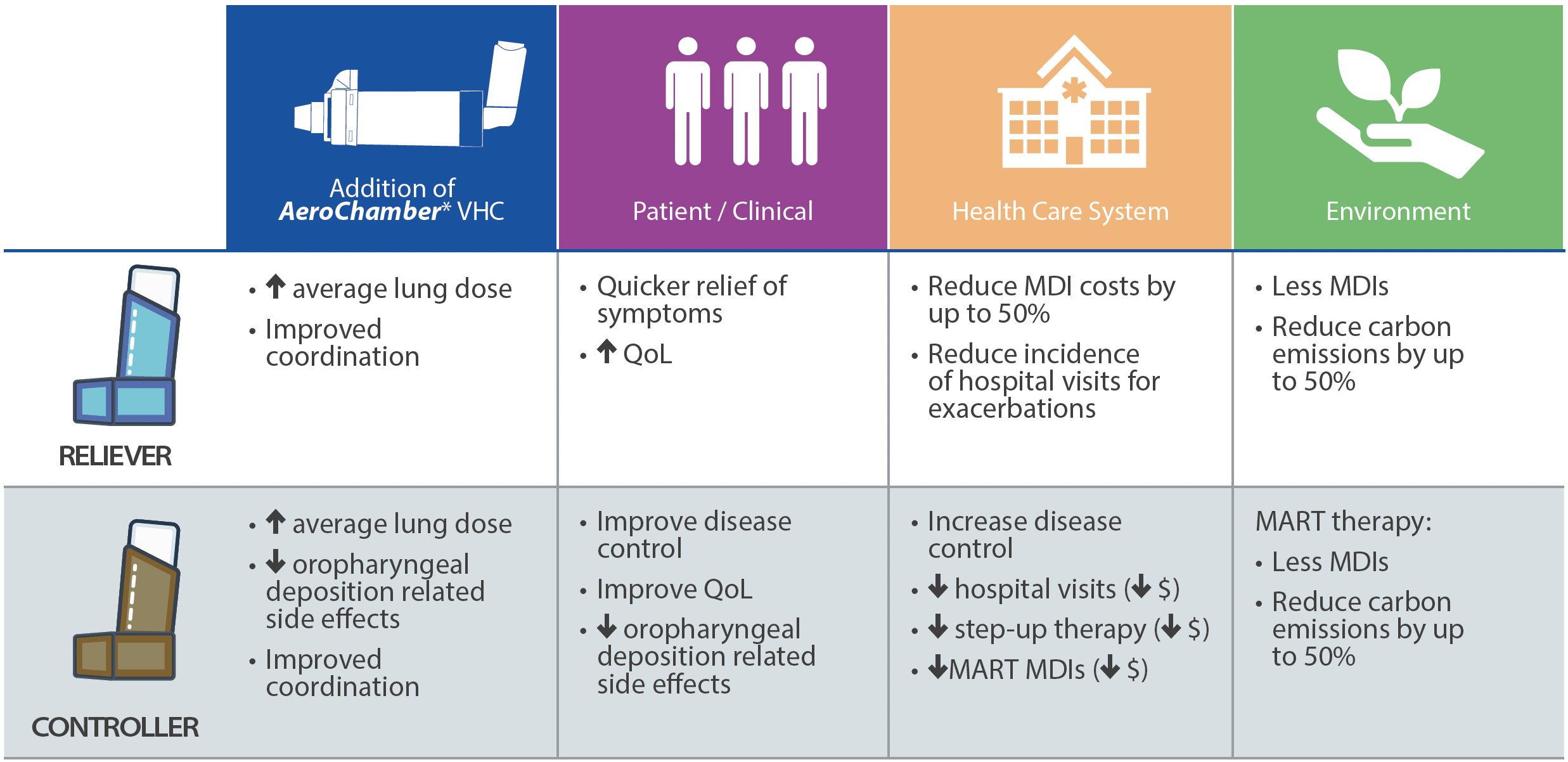For Controller MDIs it was modelled that the potential impact of switching MDI to MDI/Spacer for patient was better disease control and management of symptoms plus less ICS related side effects, for health care system was savings due to less step ups in dose and less hospitalizations, and for environment was no change or reduction in carbon emissions if patient was on MART therapy.