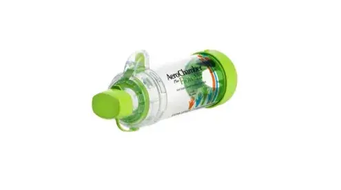 The green mouthpiece chamber is designed for children 5 years and older and includes a lower resistance inhalation valve
