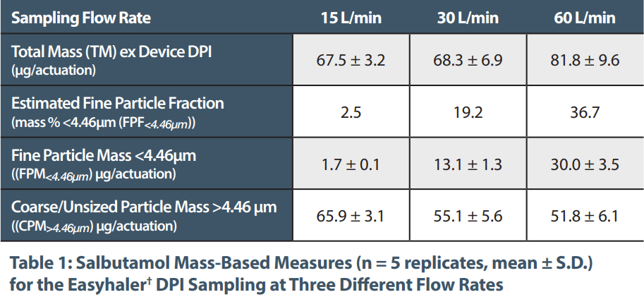 Table 1 is a summary of the key salbutamol mass-based measures at each flow rate.