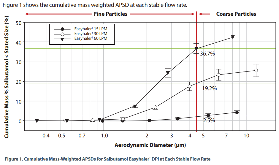 The chosen reference flowrate of 60 L/min is close to 55 L/min reported by Turpeinen et al. 2 as corresponding to a 4 kPa pressure drop across the Easyhaler† DPI delivering a salmeterol/fluticasone propionate combination, that has a moderate airflow resistance of 0.036 (kPa)1/2 min L-1.3 In the present study, the mean value of FPM4.46µm increased only slightly from 51.8% at 60 L/min to 55.1% at 30 L/min and further to 65.9% at 15 L/min (Table 1). These observations point to a loss of performance in terms of delivering potentially respirable particles at both lower flowrates than at the reference condition, a situation also observed by Vidgren et al.1