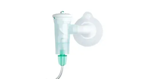 Remove the mouthpiece from your AEROECLIPSE* BAN* Nebulizer. Attach the Elbow Adapter (B) to the mouthpiece opening. Caution: The AEROECLIPSE* BAN* Nebulizer must always be upright when used with the mask, even when lying back for a treatment.