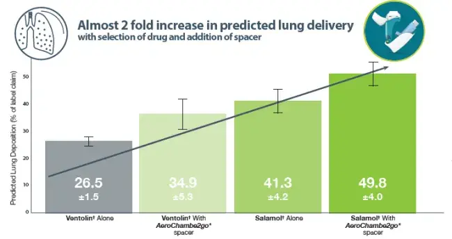 Two different salbutamol MDIs (Ventolin†, Salamol†) were investigated and tested alone and combined with an AeroChamber2go* Spacer, designed specifically for on the go use with reliever medications.