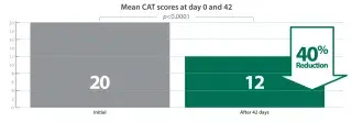 The mean CAT total score for the 40 COPD patients improved from 20.0 (initial) to 12.0 (p<0.0001) after 42 days.