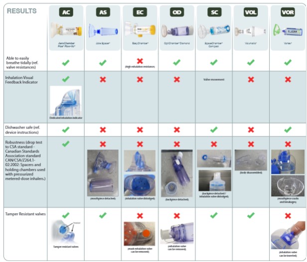 The following VHCs were evaluated (n=6/group): AeroChamber Plus* Flow-Vu* VHC (AC); Vortex† (VOR); SpaceChamber† Compact (SC); EasyChamber† (EC); OptiChamber† Diamond (OD); Able Spacer† (AS); Volumatic† (VOL). Each VHC was assessed in terms of a) Ease of tidal breathing, b) Presence of inhalation feedback, c) Dishwasher cleanable, d) Robustness and e) Tamper resistant valves.